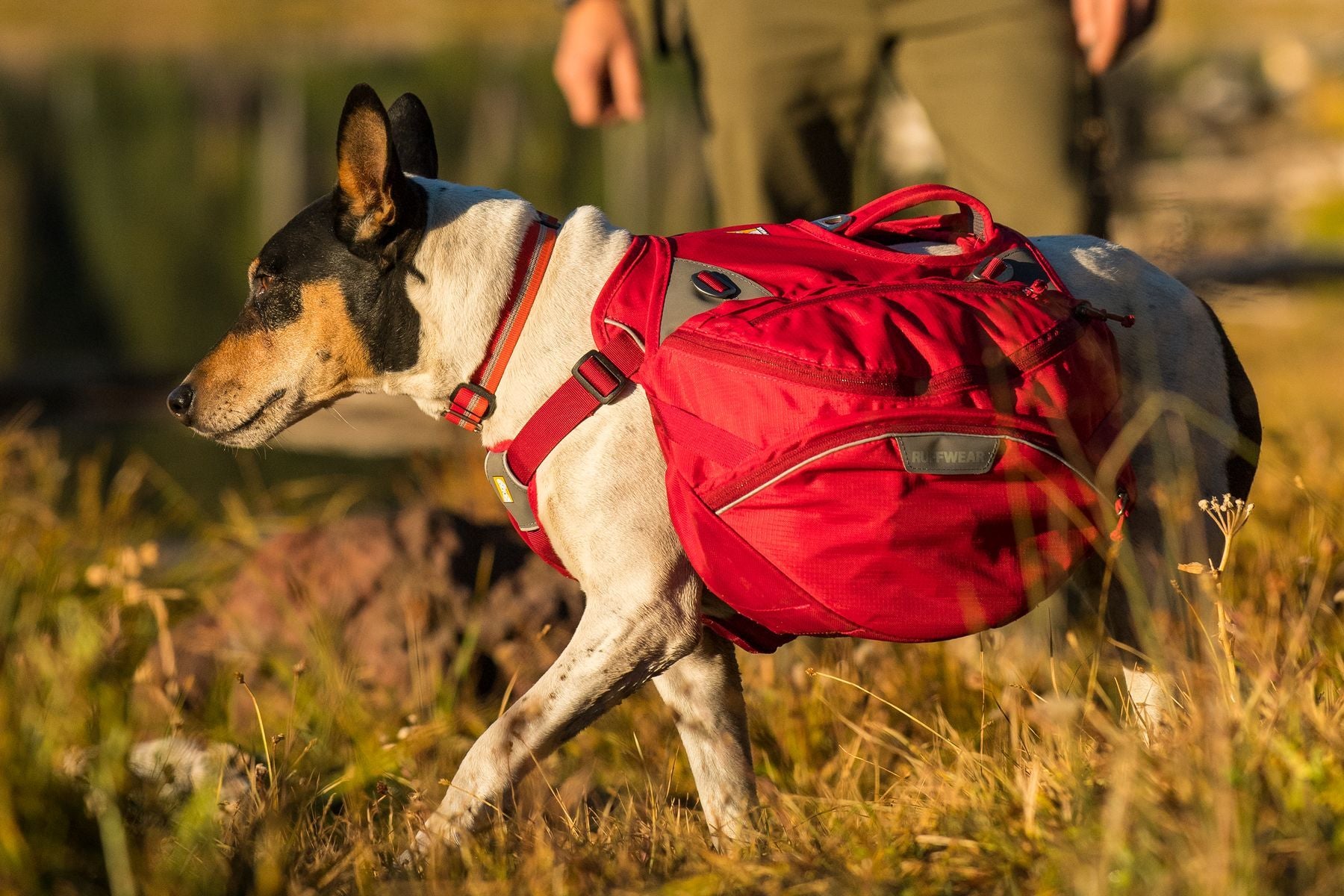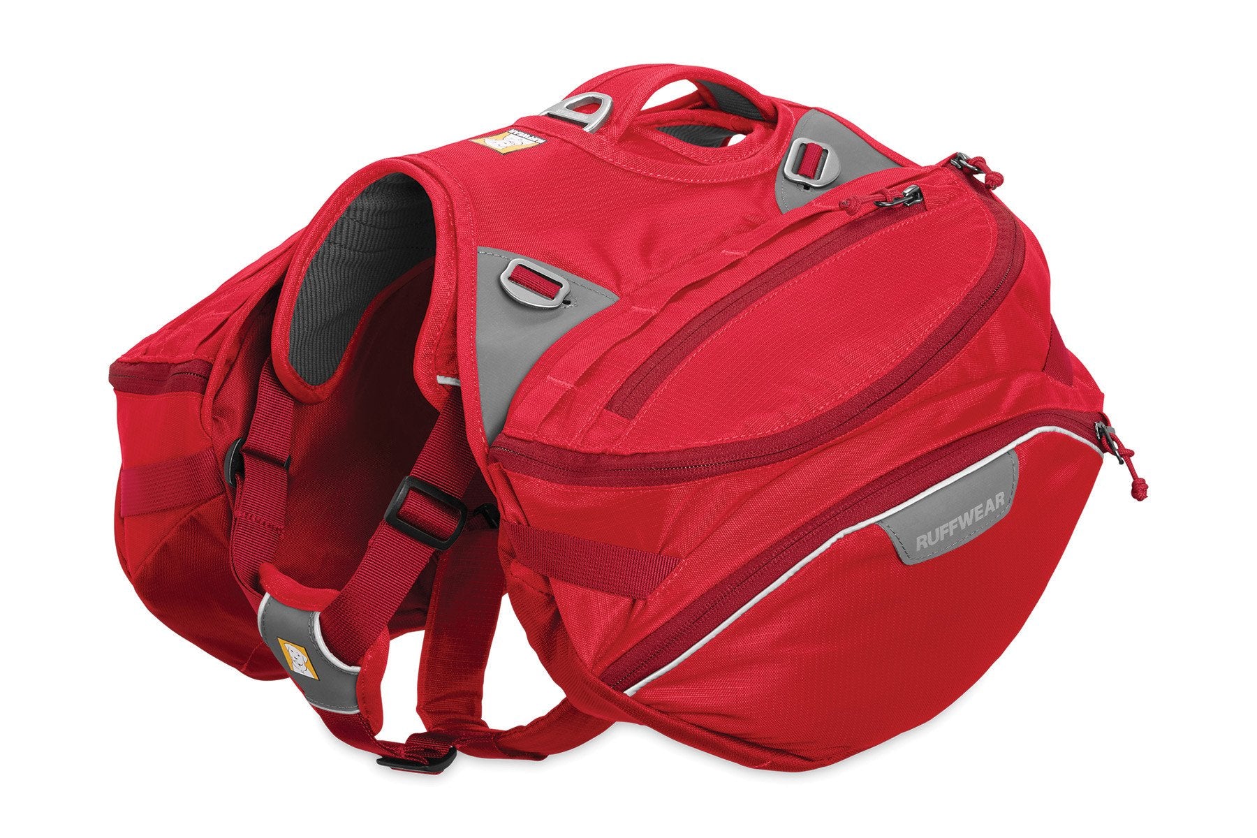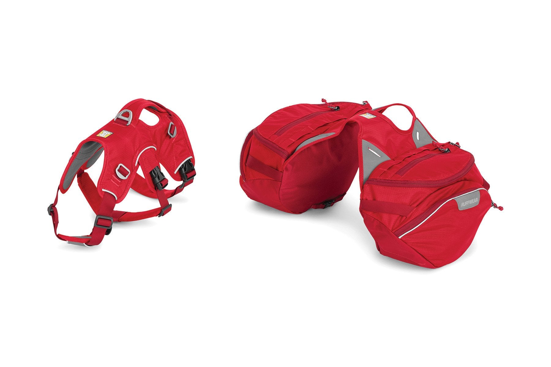 The Ruffwear Palisades™ Dog Pack enhances multi-day backcountry adventures with features like removable saddlebags, two collapsible hydration bladders, and a cross-load compression system. Four points of attachment securely connect the saddlebags to the modified Web Master™ Harness frame, ensuring load stability and comfortable weight distribution.
